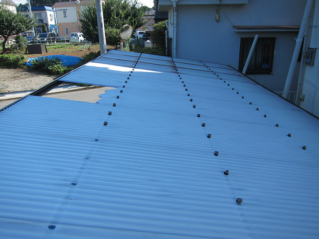 平板とフレームが歪んでいることが現地調査でわかり、屋根材の全面的な交換と固定金具の補修が必要と判断しました。